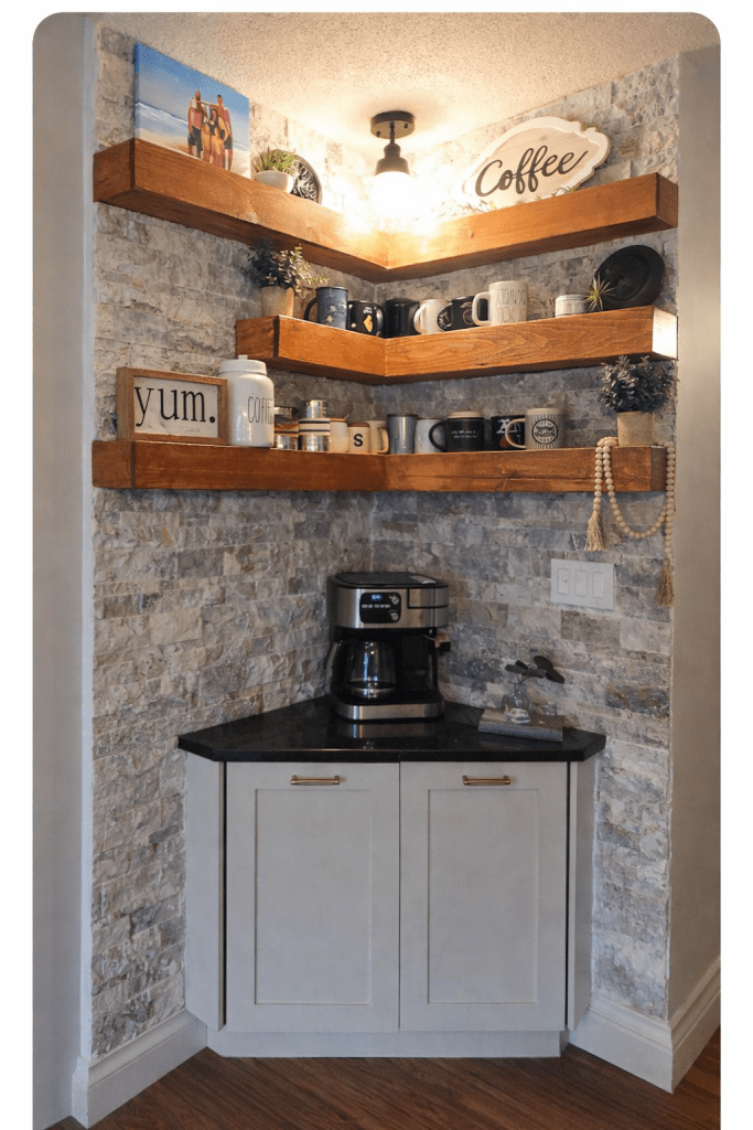 Coffee Bar Makeover: Stone Veneer & Custom Floating Shelves. There is something about a dedicated coffee bar that just makes a home feel intentional.