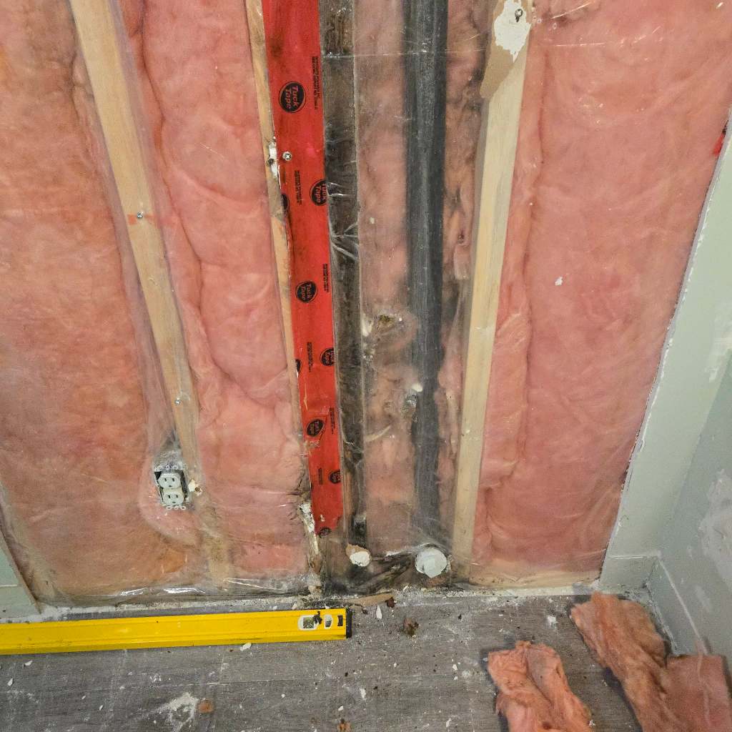 Demo and repair: down to the studs It’s never fun, but demo was necessary. We removed the damaged drywall, insulated any exposed areas as needed, and had a plumber repair and re-route the leaking pipe to prevent future issues. Once the plumbing was fixed and the framing checked for integrity, we replaced insulation where needed and installed new drywall. Taking everything back to the studs felt like a reset — a chance to do things properly and get a clean, healthy space for my stepson.